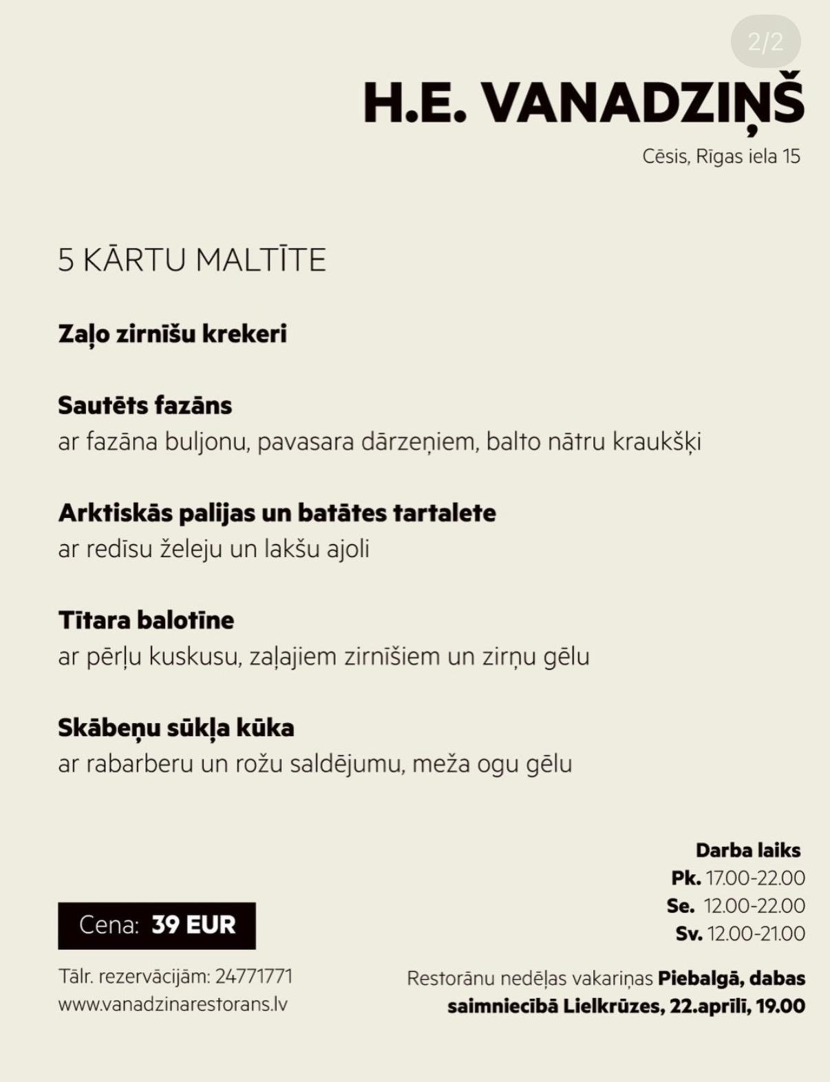 Aicinām rezervēt galdiņu un baudīt īpaši sagatavotu 4 kārtu ēdienkarti par 39 €. Izbaudiet sezonālas garšas, patīkamu atmosfēru un nesteidzīgu maltīti pie mums.